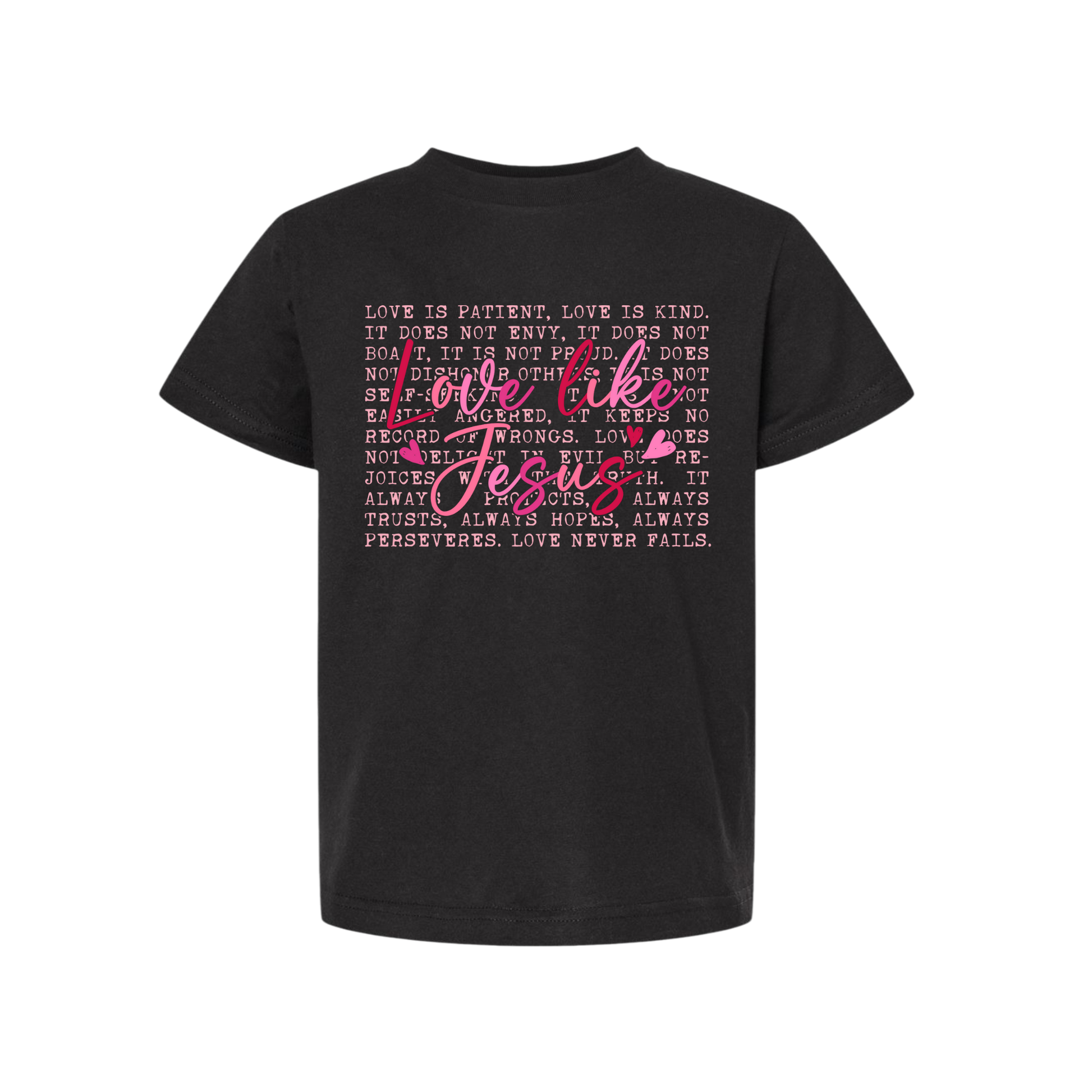 This sweet and meaningful youth tee is a reminder of what true love looks like. Featuring “Love Like Jesus” in soft pink script layered over the words of 1 Corinthians 13, this design encourages kindness, patience, and grace in everyday life